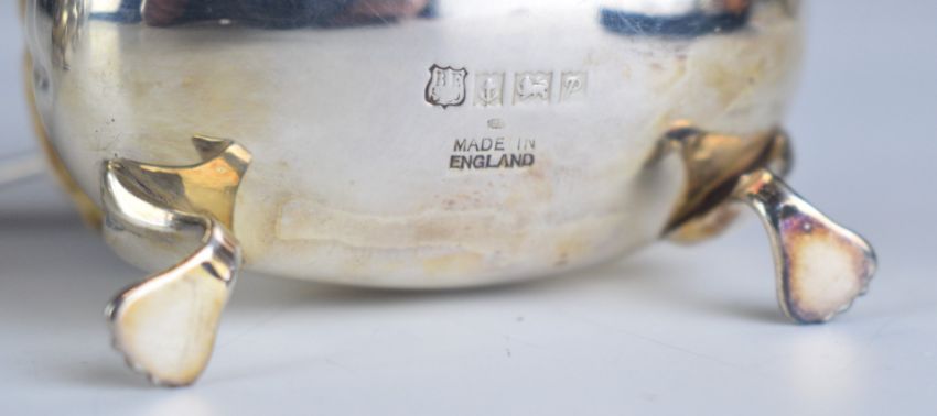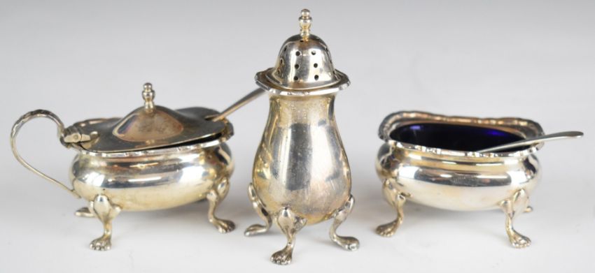 Elizabeth II hallmarked silver three piece cruet set with blue glass liners and matching spoons, Birmingham 1965, maker Barker Ellis Silver Co, height of pepper 8cm, weight excluding blue glass liners 125g