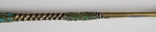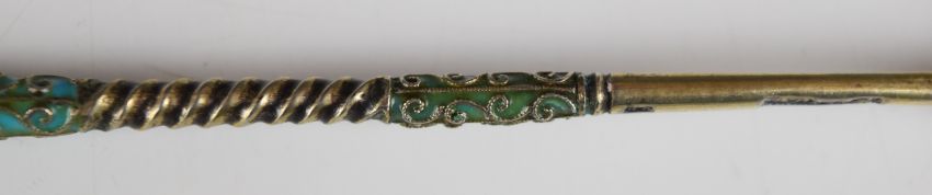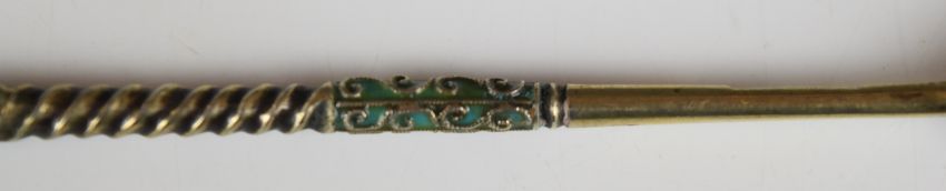 Ukrainian/ Russian silver gilt and enamel spoon with 84 grade silver marks, maker Aleksandr Kazimovich Vyrzhikovsky of Kiev, length 14cm, weight 21g