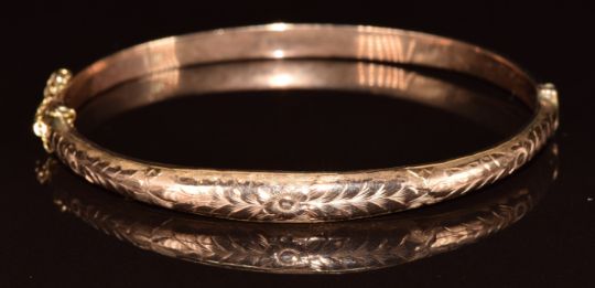 Edwardian 9ct rose gold bangle with engraved floral decoration, Birmingham 1904, 5.4g