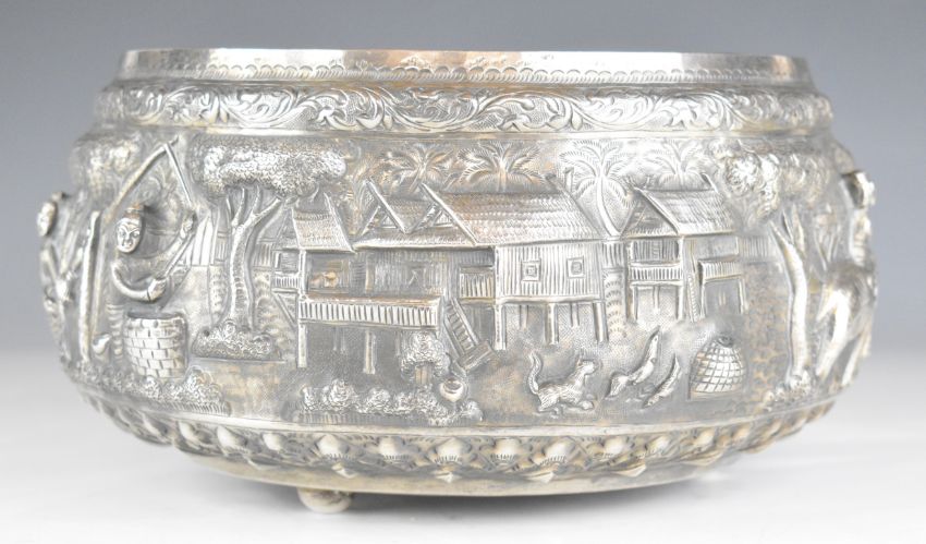 Burmese, Indian or similar silver bowl with embossed border of silver figures and animals, marked to base 100% and signed, diameter 25cm, weight 913g