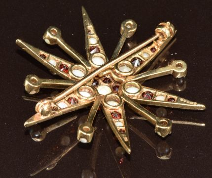 A 9ct gold star brooch set with pearls and garnets, 7g, 4cm