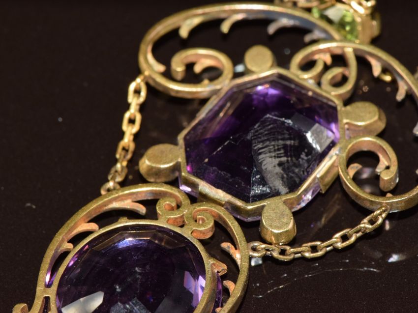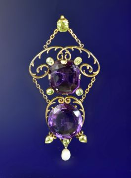 Suffragette silver gilt pendant set with oval cut and emerald cut amethysts of approximately 15ct & 13ct, peridots and a pearl, 15.7g, 8 x 3.6cm