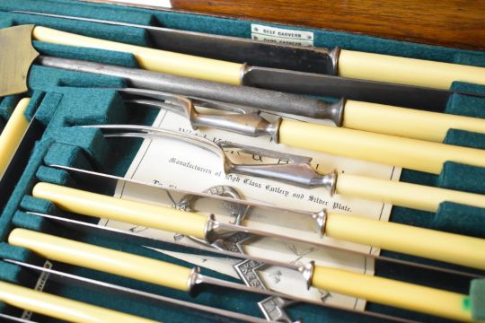 Walker & Hall oak cased twelve place setting canteen of silver plated cutlery, the canteen having two lift out trays, the top one with ivory handled knives, overall width of canteen 47.5cm, with ivory licence