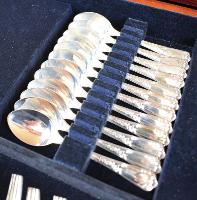 Carrs twelve place setting canteen of hallmarked silver cutlery, comprising twelve each of dinner forks, dessert forks, fish knives and forks, dessert spoons, teaspoons, coffee spoons and table and dessert knives, four table spoons, two butter knives, cheese knife, cake slice, sauce ladle, soup ladle and carving set, weight excluding silver handled items 5740g, width of canteen 49.5cm, together with a hallmarked silver salt and pepper