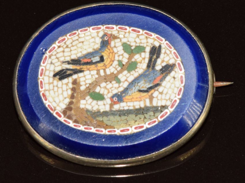 A 19thC micro mosaic brooch depicting two birds and verso a bouquet of flowers, 9.9g, 3.1 x 2.6cm