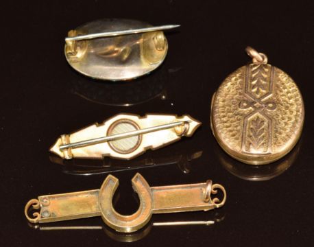 A c1910 9ct gold horseshoe brooch (2.3g), yellow metal Victorian locket (6.1g), 9ct gold brooch (1.6g) and a Victorian brooch set with turquoise
