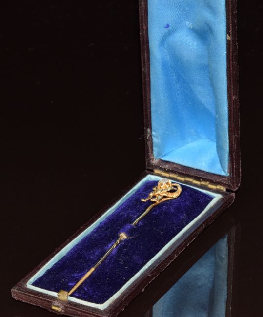 Victorian yellow metal stick pin set with an old cut diamond of approximately 0.15ct in a bow setting, in antique box, 4.1g, 8cm