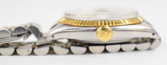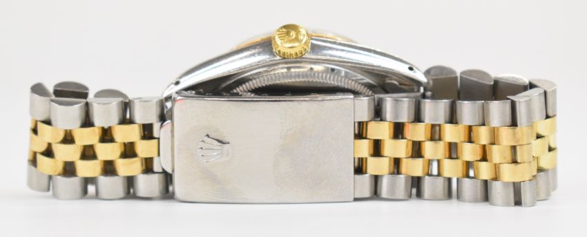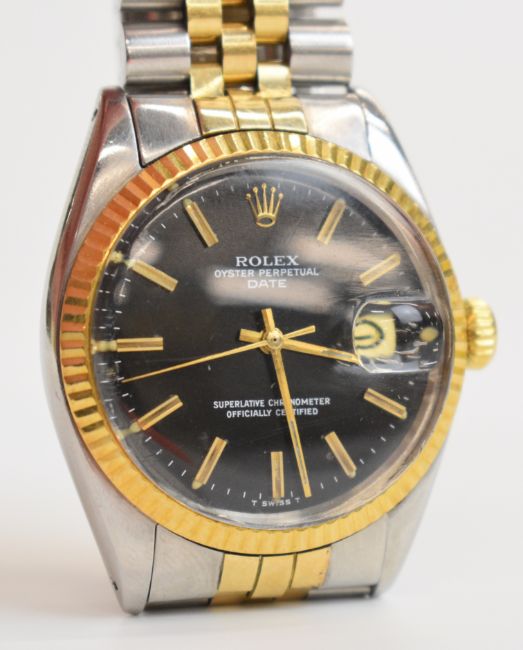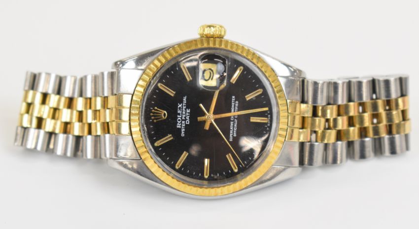 Rolex Oyster Perpetual Date gentleman's automatic wristwatch ref. 1601 with date aperture, luminous gold hands, gold baton hour markers, black dial, gold bevelled bezel, stainless steel case and signed 26 jewel calibre 1570 movement, on bi-metal bracelet, case diameter 36mm, serial number 1307430.