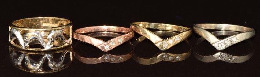 Four 9ct gold rings, three set with diamonds and matching but in different coloured gold, 4.6g, size L & K