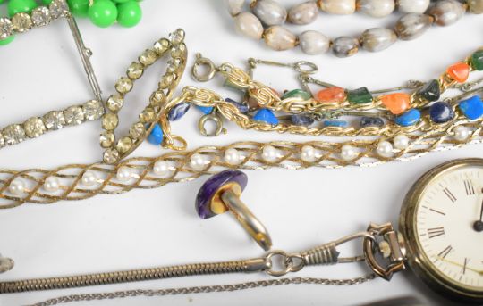 A collection of jewellery including Victorian brooch, two silver rings, rolled gold necklace, white metal compact, silver buckle bangle, paste set buckles, beaded necklaces, silver brooch, 9ct gold charm, cut steel button, etc