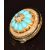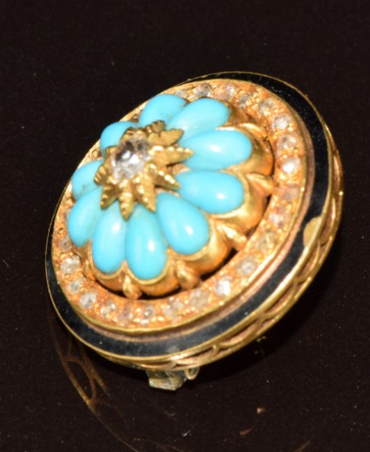 Victorian brooch set with an old cut diamond surrounded by turquoise cabochons, further surrounded by rose cut diamonds within a border of black enamel, 6.2g, 2cm