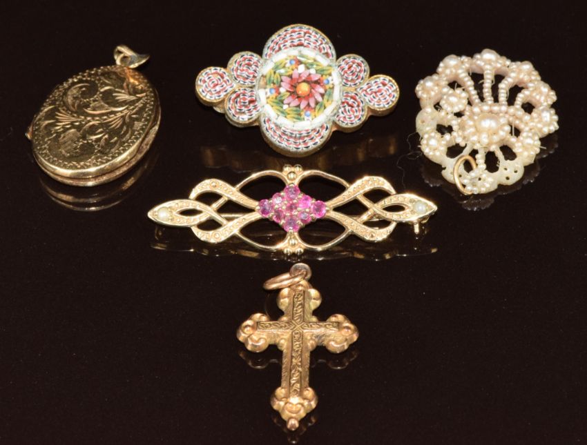 A c1900 micro mosaic brooch, 9ct gold locket with engraved scrolling decoration (4.2g), 9ct gold brooch set with rubies and pearls (2.7g), Victorian cross and Georgian pearl brooch