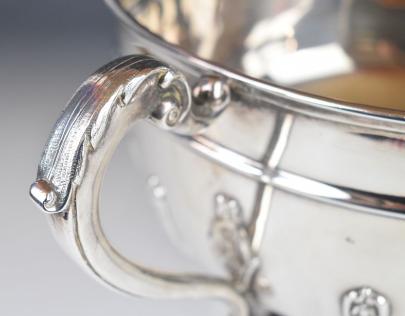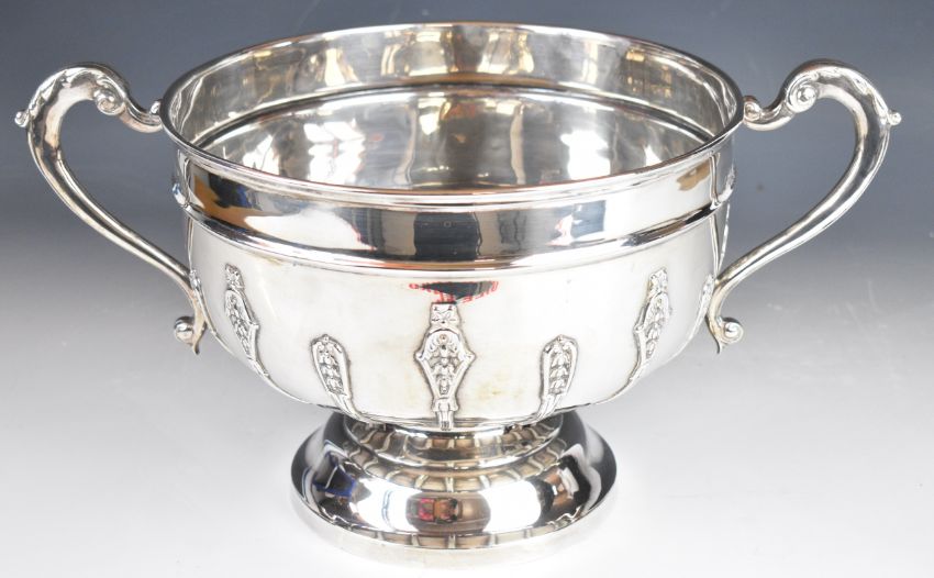 Edward VII hallmarked silver twin handled punch bowl with applied foliate decoration and scroll handles, London 1909, maker Charles Boyton & Son Ltd, width 44cm, weight 2053g