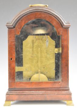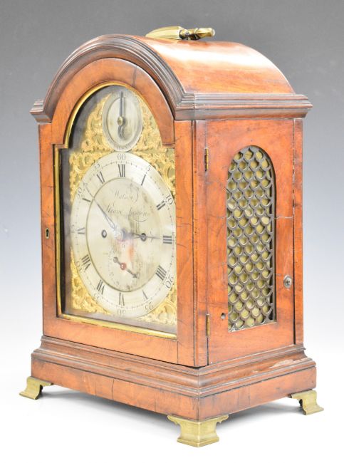 Watson, Strand, London Georgian bracket clock, the two train movment having engraved rear plate and striking on a bell, the dial having silvered chapter ring and strike silent to top with subsidiary date dial, all raised on four bracket feet and with fishcale fret panels to the sides, overall height 40cm