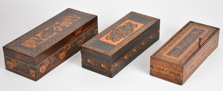 Three 19thC Tunbridgeware glove boxes, largest W27 x D10 x H7cm