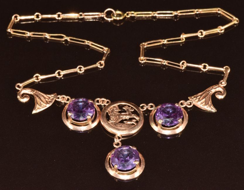 A 12k Egyptian gold necklace set with three round cut synthetic colour change sapphires