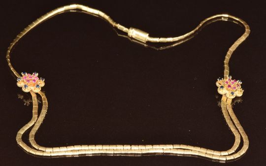 An 18ct gold necklace made up of rectangular textured links with two flower sections set with sapphires and rubies, 29.6g, 45cm