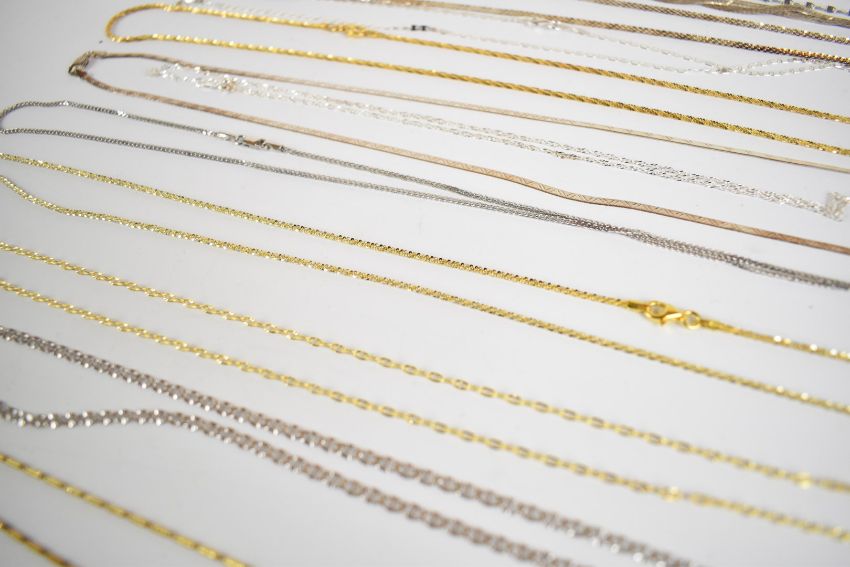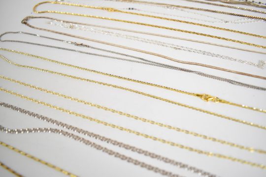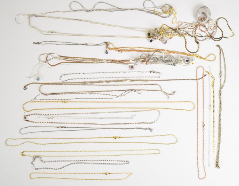 Forty five silver necklaces including silver gilt, ribbon, curb link, etc , 173g