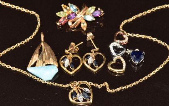 A 9k white gold pendant set with a sapphire (0.6g), 14k gold pendant set with Larimar (1.6g), 9k gold heart pendant and matching earrings set with sapphires and diamonds (5.1g), a 9k gold pendant set with diamonds and a 9k gold brooch set with amethysts, citrine, peridot and topaz (3.8g)