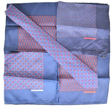 Three Hermès silk pocket squares or handkerchiefs, one with matching Hermes silk tie, approximately 45 x 45cm