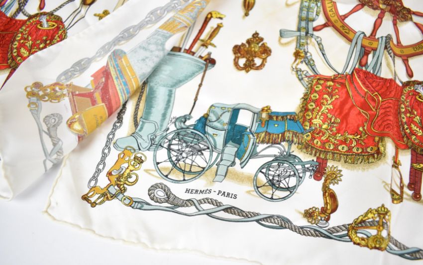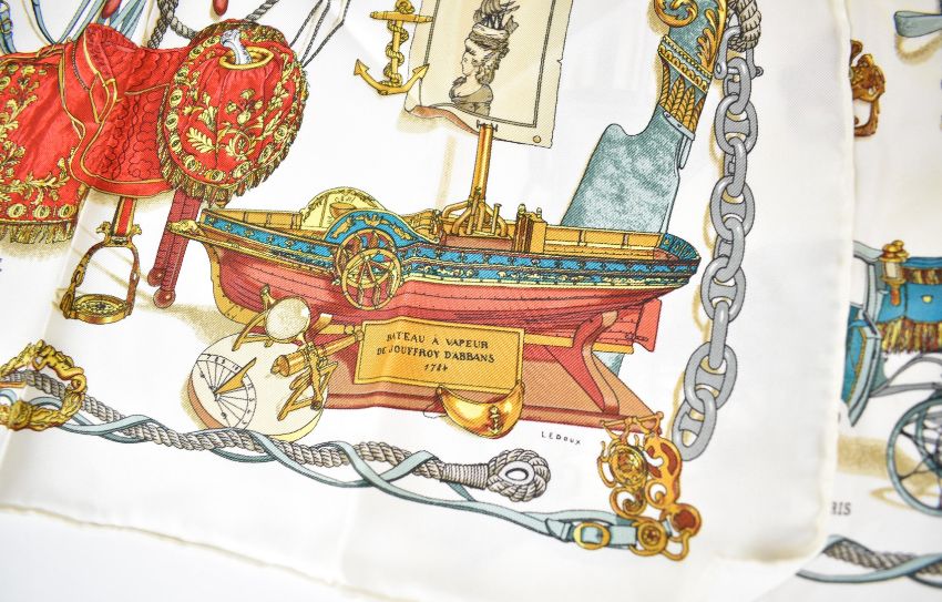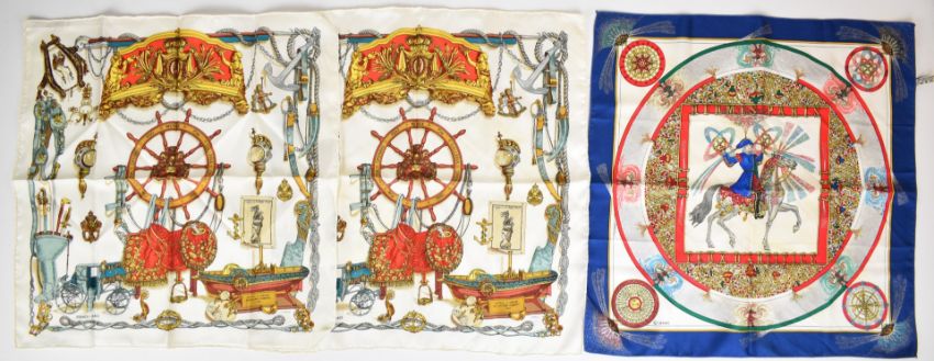 Three Hermès silk pocket squares or handkerchiefs comprising 'Gavroche Feux d'Artifice' and two 'Musée The Galleria Opening 1992', approximately 45 x 45cm