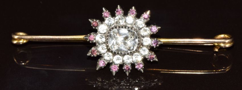 Victorian yellow metal brooch set with foiled paste, in vintage box, 6.3g, 6cm