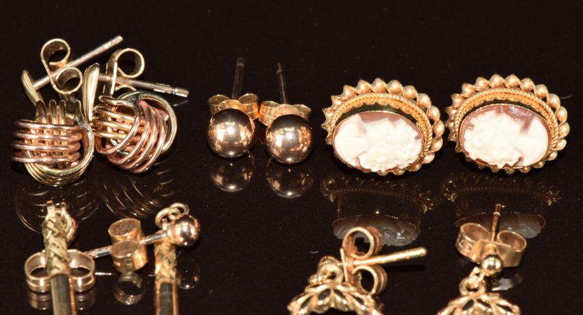 Six pairs of 9ct gold earrings including cameo, rubies, knot, etc , 11.7g
