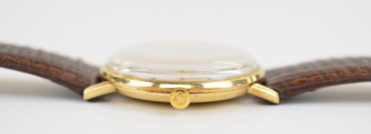 Omega 9ct gold gentelman's wristwatch ref. 131.5016 with two-tone hands and baton hour markers, silver dial and signed calibre 601 movement, on brown leather strap, case diameter 34mm, serial number 29900196, with International Guarantee and related paperwork.