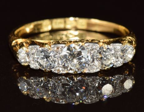 An 18ct gold ring set with five graduated diamonds with smaller diamonds between, the centre diamond approximately 0.48ct, Chester 1917, 3.1g, size M