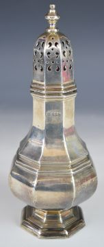Art Deco hallmarked silver sugar caster of octagonal baluster form, Sheffield 1934, maker Cooper Brothers & Sons Ltd, height 19.5cm, weight 204g