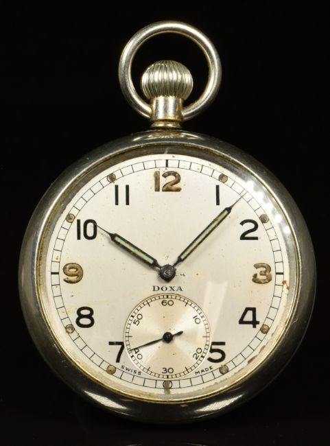 Doxa keyless winding open faced military pocket watch with inset subsidiary seconds dial, luminous blued hands, Arabic numerals, silver dial and case back stamped 'GSTP 238787' below ministry broad arrow, case diameter 52mm.