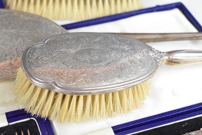 Hallmarked silver mounted dressing table items comprising Mappin & Webb hand mirror and two brushes, further hand mirror, hallmarked silver lidded cut glass dressing table pot and two cased sets of mother of pearl handled cutlery, width of larger case 28cm