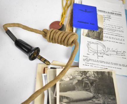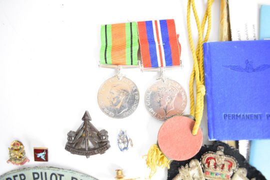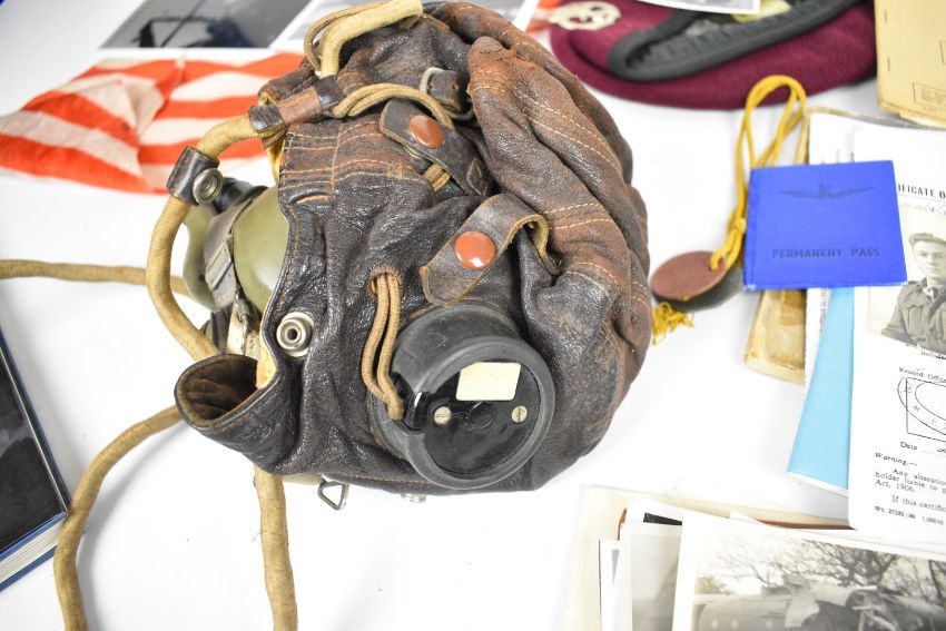 WW2 RAF and Glider Pilot Regiment medals and ephemera relating to John Letherbarrow including red beret and cap badge, Airborne patch, identity discs, cloth and bullion breast badge, cloth shoulder title, leather flying helmet with communication cord and oxygen mask, further oxygen mask, enamel badges, photographs, soldier's pay book, soldier's release book, Defence Medal and War Medal, signed silk pennant from Booker September 1945 etc