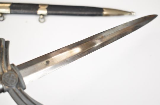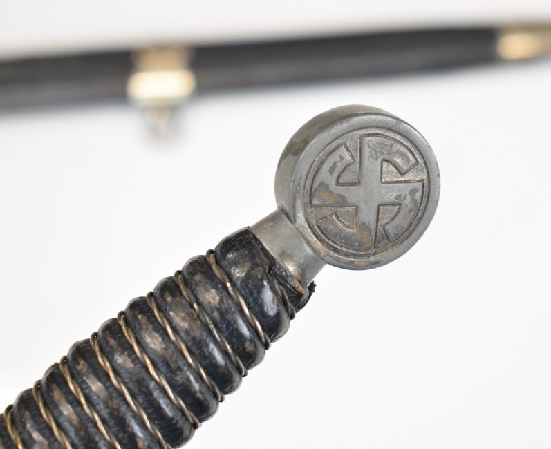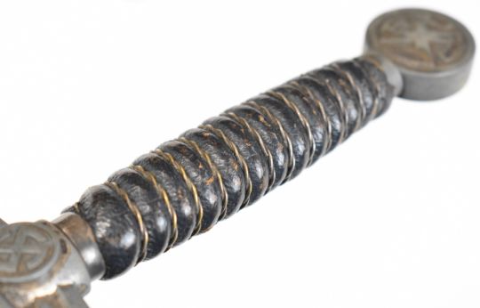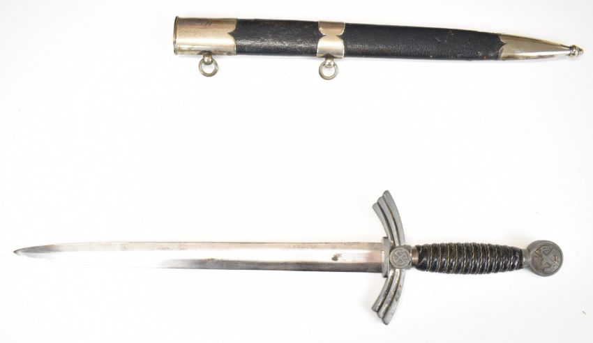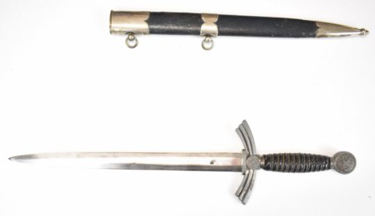 German WW2 Nazi Third Reich Luftwaffe dagger, late first pattern, with wire bound leather covered grip, 30cm double edged blade and scabbard. PLEASE NOTE: WE ARE NOT ABLE TO OFFER OUR USUAL POSTAGE SERVICE FOR THIS LOT