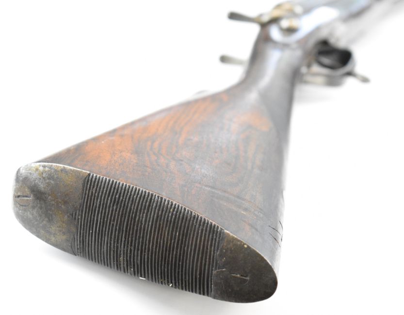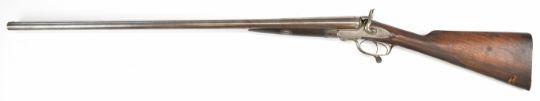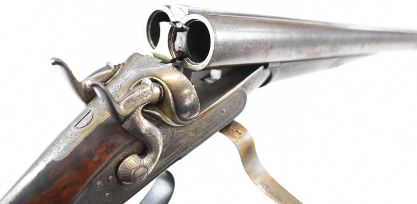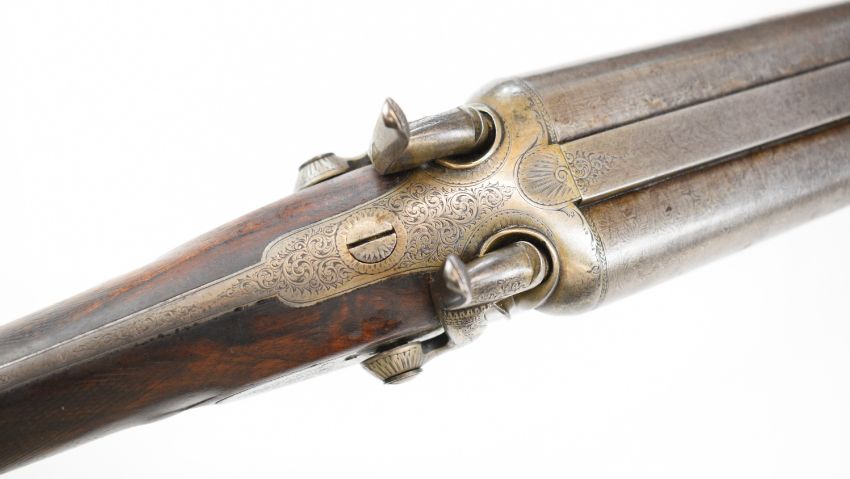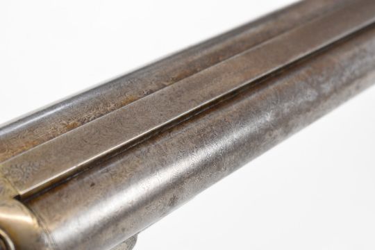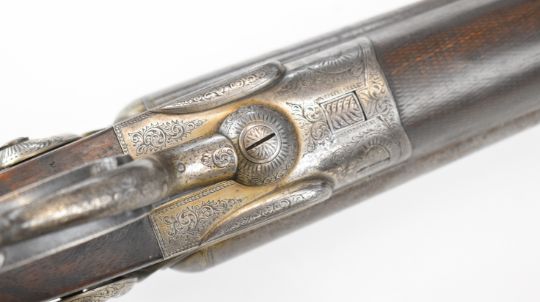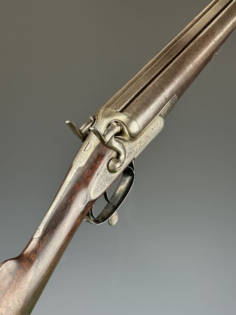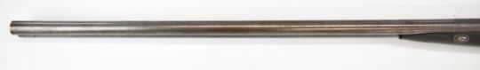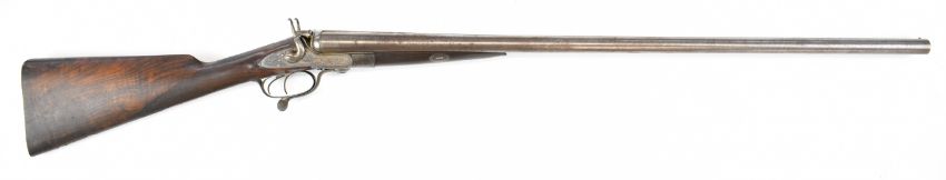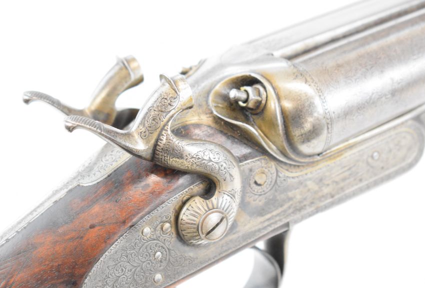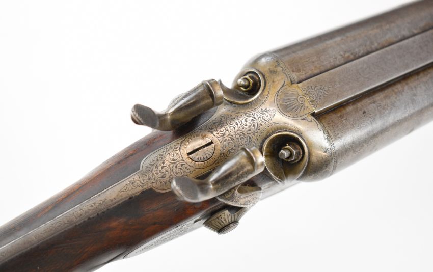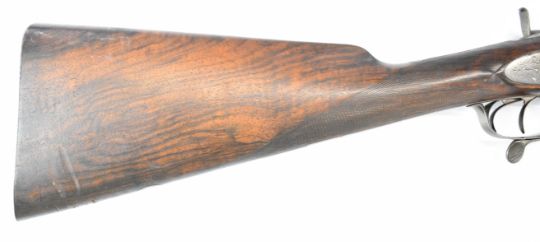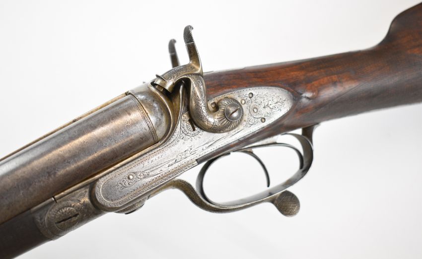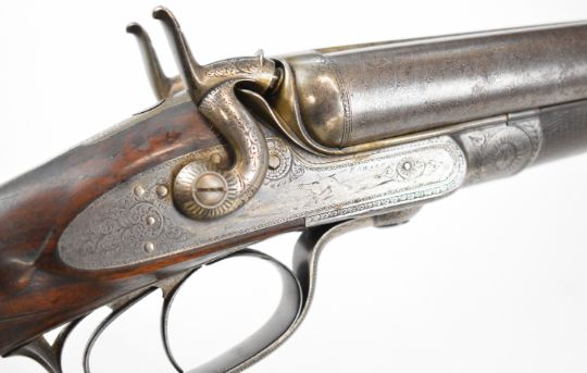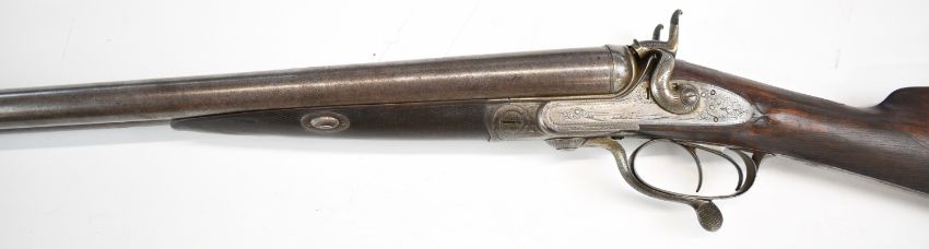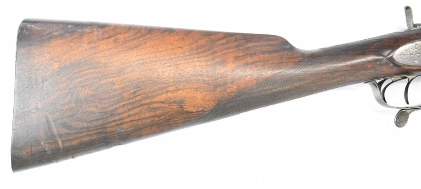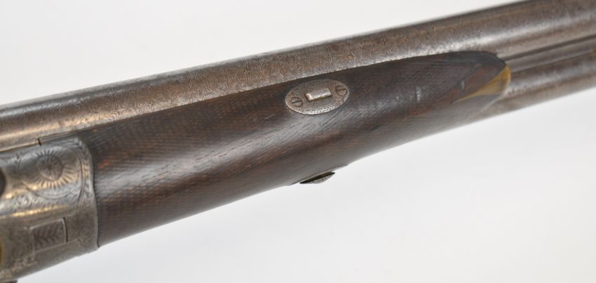 English 12 bore side by side hammer action shotgun with engraved locks named 'F Sharp', engraved hammers, underside, rotary underlever, trigger guard, top strap and fences, chequered grip and horn tipped forend, vacant cartouche to the underside of the stock, carved teardrop to the stock, double trigger and 31.25 inch Damascus barrels choked cylinder engraved to the rib 'J Hesketh High St Arundel' and stamped to the underside 'G. Willis', overall length 118.5cm, length of pull 36.5cm, serial number 4683. PLEASE NOTE THAT THIS GUN IS BEING SOLD AS STOCK AND ACTION ONLY AND THAT A VALID RELEVANT RFD CERTIFICATE IS REQUIRED TO VIEW OR PURCHASE THIS LOT.