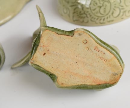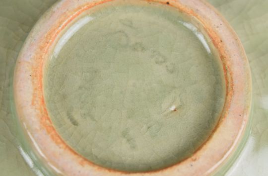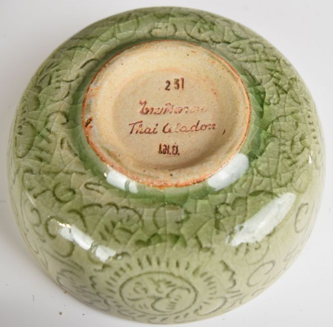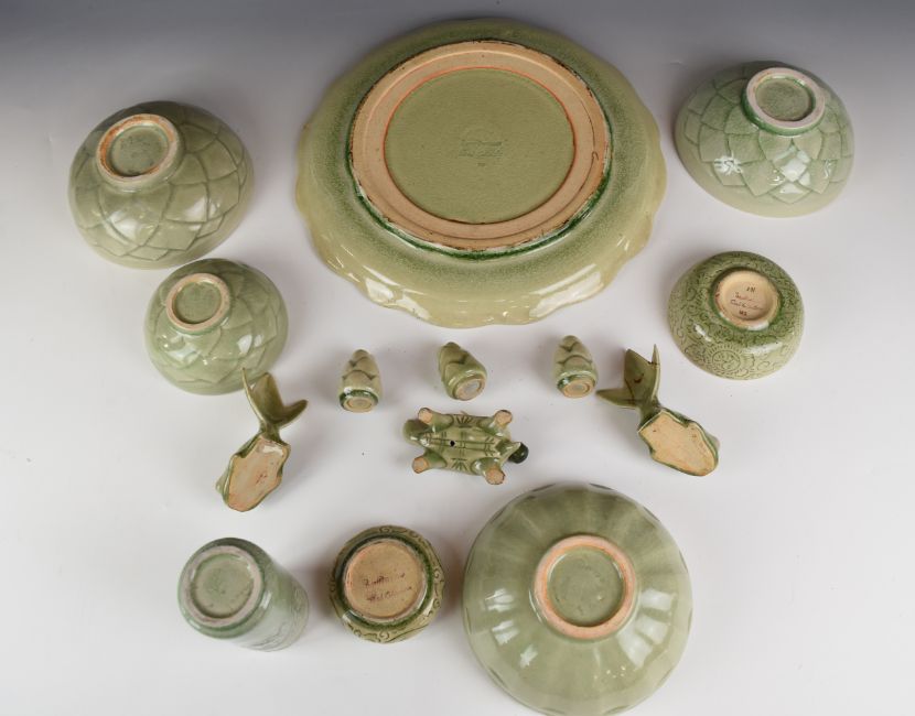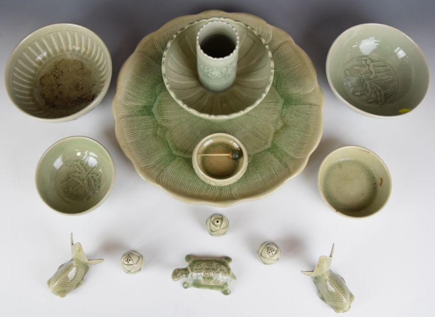 Collection of Chinese celadon ceramics including a large platter, vase & dishes, largest diameter 36cm