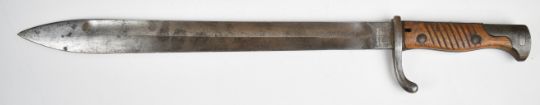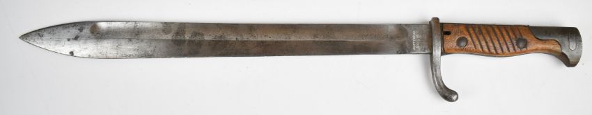 German WW1 98/05 pattern bayonet, later model with flash guard, Waffenfabrik Mauser Ag Oberndorf to ricasso and scabbard and a 36.5cm fullered blade. PLEASE NOTE: WE ARE NOT ABLE TO OFFER OUR USUAL POSTAGE SERVICE FOR THIS LOT