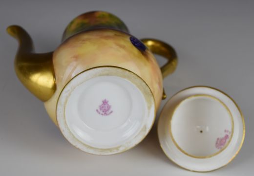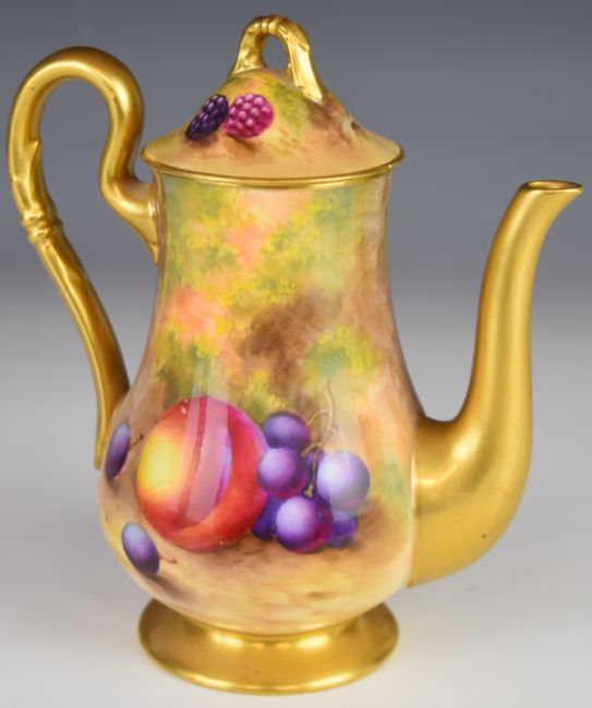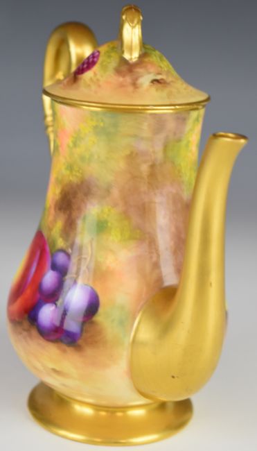 Royal Worcester painted fruit coffee or teapot decorated with peaches, grapes and blackberries, signed Ayrton, H16.5cm