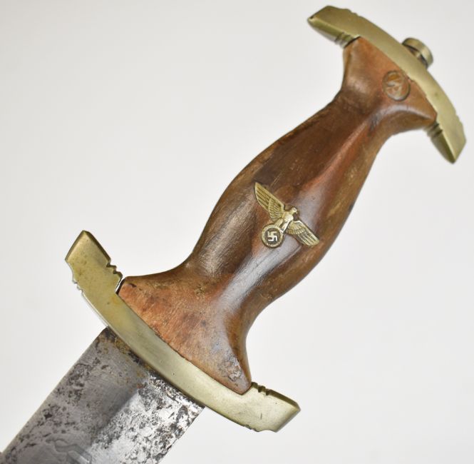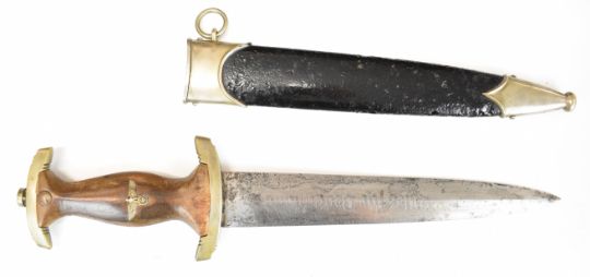 German Nazi Third Reich SA dagger with area mark Nm to crossguard, Gersch Solingen to 22cm double edged blade and scabbard. PLEASE NOTE: WE ARE NOT ABLE TO OFFER OUR USUAL POSTAGE SERVICE FOR THIS LOT