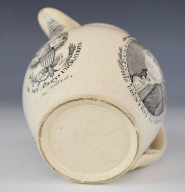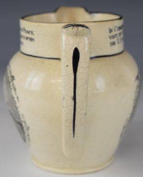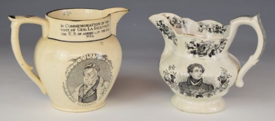 Two 19thC commemorative jugs comprising United States of America interest with cartouches 'Republicans are not always vengeful', 'Washington the country's first father - first in war, first in peace and first in the hearts of the fellow citizens' and 'Fayette, the nation's guest, in commemoration of the visit of Gen La Fayette to the US of America in 1824', H12.5cm and a George IV jug, H13cm