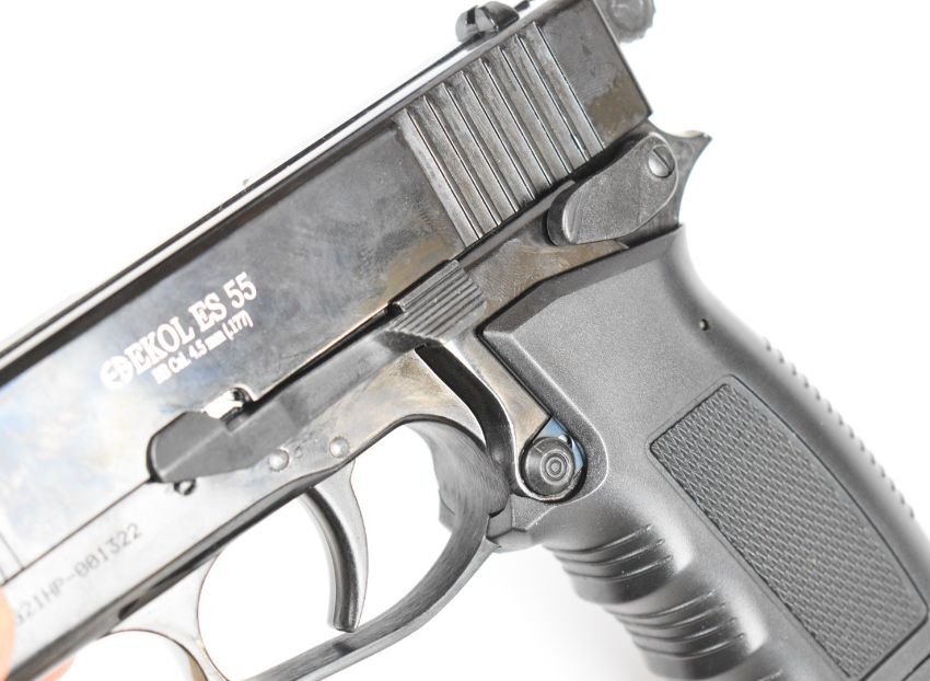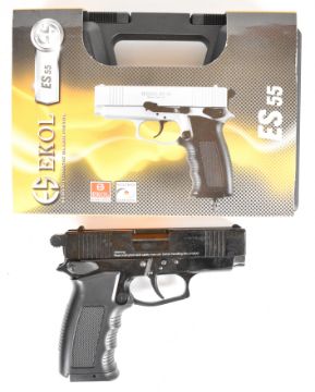 Ekol ES 55 .177 CO2  air pistol with chequered composite grips and fixed sights, serial number 90-G21HP-001322, in original carry case with outer sleeve, instructions and accessories. PLEASE NOTE: IF YOU REQUIRE POSTAGE, THIS LOT CAN ONLY BE SENT TO AN RFD