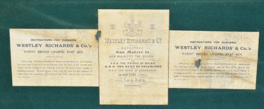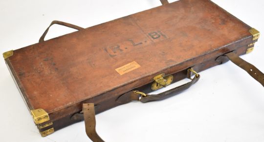Westley Richards & Co brass and leather bound double shotgun carry case with fitted interior and 'Westley Richards & Co Limited Patentees Gun Makers to Her Majesty The Queen and By Special Appointment to HRH The Prince of Wales, HRH The Duke of Edinburgh and HRH The Duke of Connaught 178 New Bond Street London Established 1812' and 'Instructions For Cleaning Westley Richards' & Co.'s Patent Breech Loading Snap Gun' labels, 84 x 36 x 9cm.