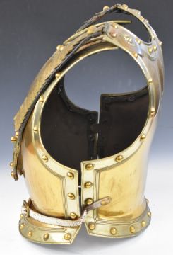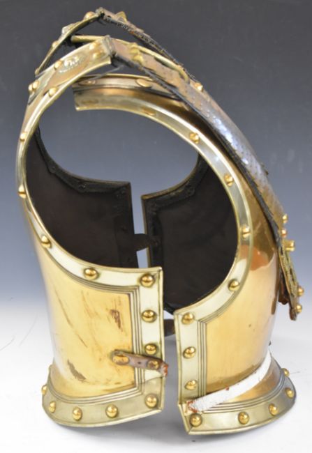 Imperial German Gardekorps cuirass armour having brass studded and leather and brass strap decoration, with lion masks to top, overall height 46cm, on wooden stand