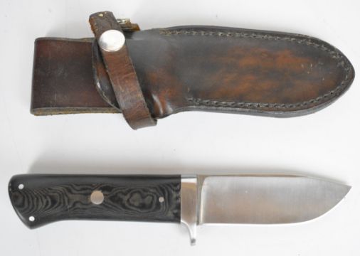 Rory Conner Irish hunting knife with composite grips and signed 10cm steel blade, in leather sheath. PLEASE NOTE: WE ARE NOT ABLE TO OFFER OUR USUAL POSTAGE SERVICE FOR THIS LOT