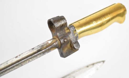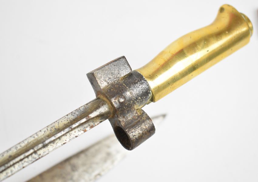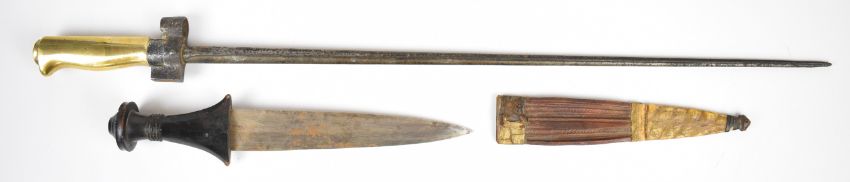 French 1886 pattern Lebel bayonet without quillon, with brass grip and 51cm cruciform blade, together with a tribal knife with sheath. PLEASE NOTE: WE ARE NOT ABLE TO OFFER OUR USUAL POSTAGE SERVICE FOR THIS LOT