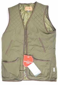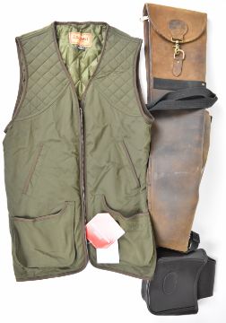 Three shooting and gun related items comprising a leather shotgun or rifle slip, leather cartridge bag and a Schoffel Gore Windstopper Stamford shooting vest 6840 size 42.