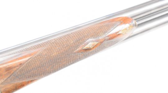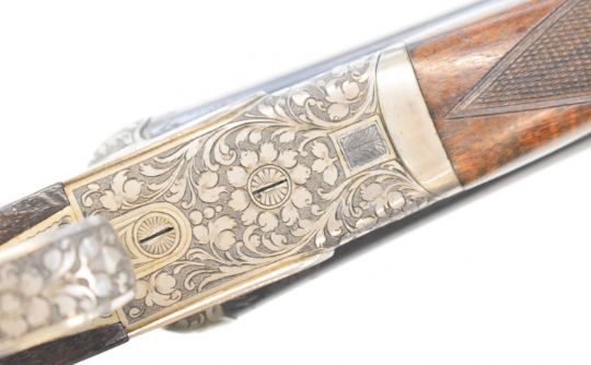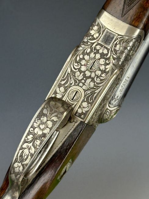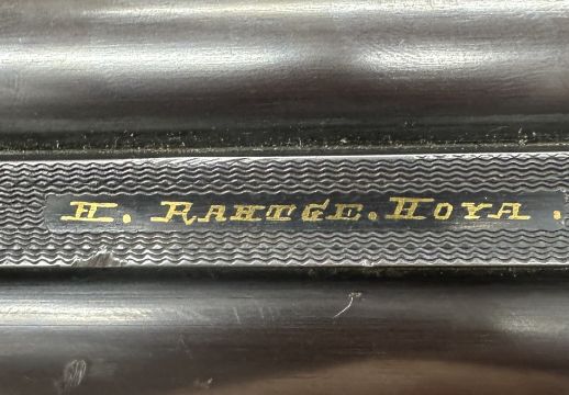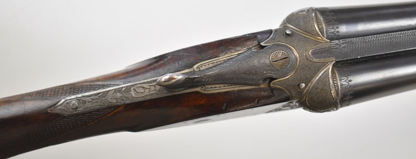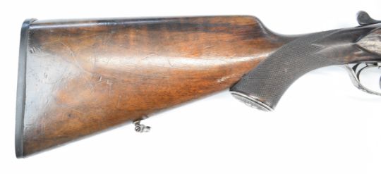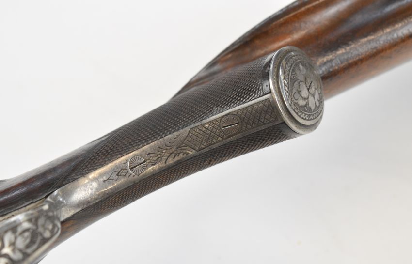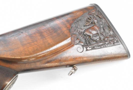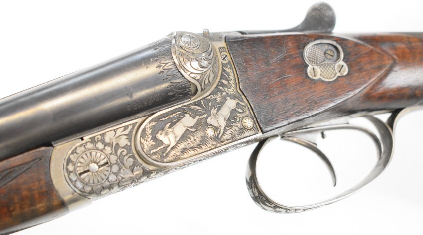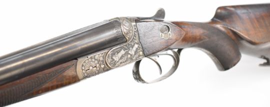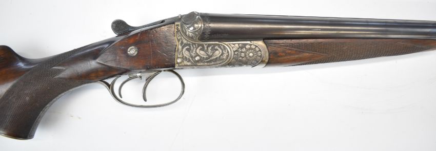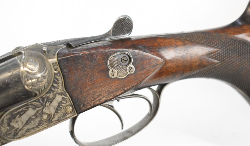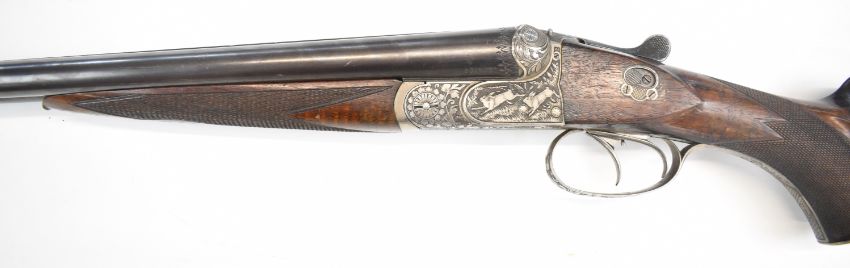 German 16 bore side by side shotgun with heavily engraved scenes of birds and rabbits to the locks, engraved underside, trigger guards, grip butt cap, top plate, thumb lever and fences, cocking indicators. chequered semi-pistol grip and forend, raised cheek piece, heavily carved decoration of a stag to the stock, sling mounts, double trigger and 29 inch barrels inlaid in gold 'H. Rahige Hoya', overall length 114.5cm, length of pull 35cm, serial number 12744. PLEASE NOTE THAT A VALID RELEVANT SHOTGUN CERTIFICATE IS REQUIRED TO VIEW OR PURCHASE THIS LOT AND FOR ALL SHOTGUNS OR RIFLES PLEASE ENSURE YOU HAVE THE RELEVANT CERTIFICATE BEFORE BIDDING.