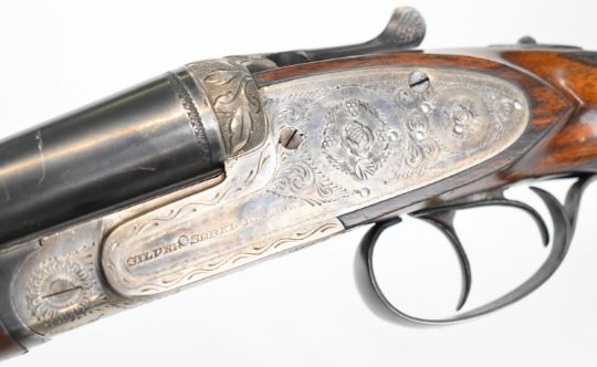 Silver Sabel De Luxe 12 bore sidelock side by side ejector shotgun with rose and scroll engraving to the named locks, underside, trigger guard, top plate, thumb lever and fences, chequered grip and forend, vacant cartouche to the underside of the stock, double trigger and named 27 inch barrels choked improved cylinder and ½, overall length 111.5cm, length of pull 36.5cm, serial number PG93733. PLEASE NOTE THAT A VALID RELEVANT SHOTGUN CERTIFICATE IS REQUIRED TO VIEW OR PURCHASE THIS LOT AND FOR ALL SHOTGUNS OR RIFLES PLEASE ENSURE YOU HAVE THE RELEVANT CERTIFICATE BEFORE BIDDING.