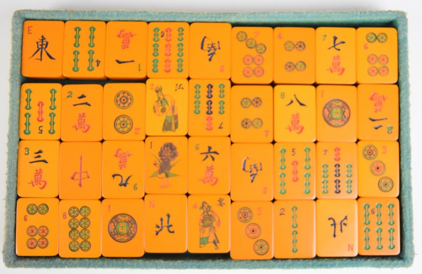 Chinese Mah-jong set, in leather case with plaque 'Van Fong National Products Co, Singapore', the impressed lock 'Made by Kiu Yih', W24 x D18 x H14cm