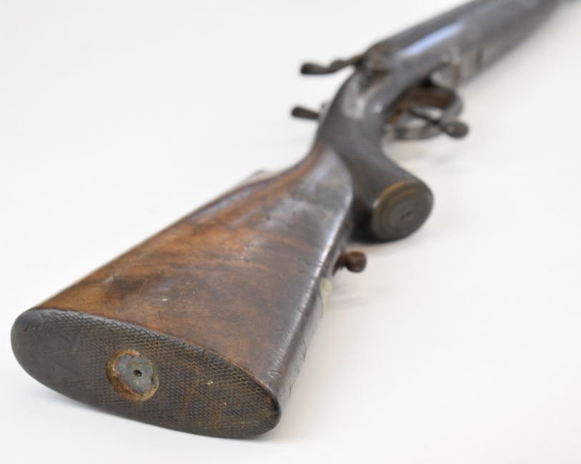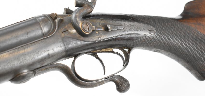 Graham & Son of Inverness .410 side by side hammer action shotgun converted from a rifle with named and engraved locks, engraved rotary underlever and top plate, chequered semi-pistol grip and forend, horn grip butt cap, sling mounts, vacant cartouche to the underside of the stock, double trigger and 21 inch J Ritchie of Aberdeenshire barrels, overall length 91cm, length of pull 33cm, serial number 24670/ 705. PLEASE NOTE THAT A VALID RELEVANT FIREARMS CERTIFICATE IS REQUIRED TO VIEW OR PURCHASE THIS LOT AND FOR ALL SHOTGUNS OR RIFLES PLEASE ENSURE YOU HAVE THE RELEVANT CERTIFICATE BEFORE BIDDING.